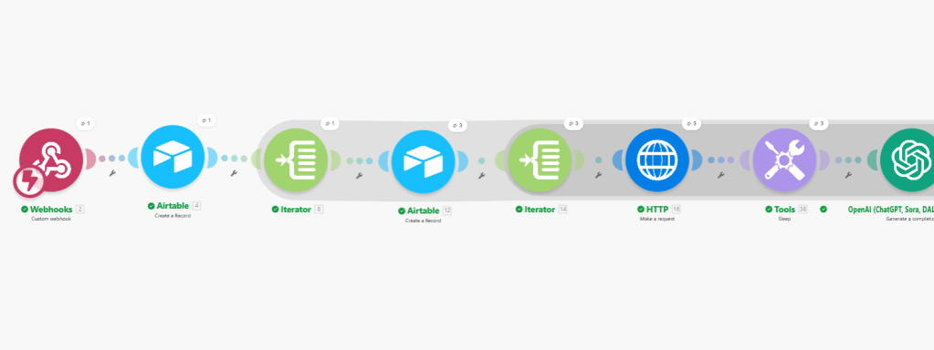 - Aggregate page insights — Once all pages for a company are processed, Make collects them and sends them to OpenAI for a unified company positioning summary.